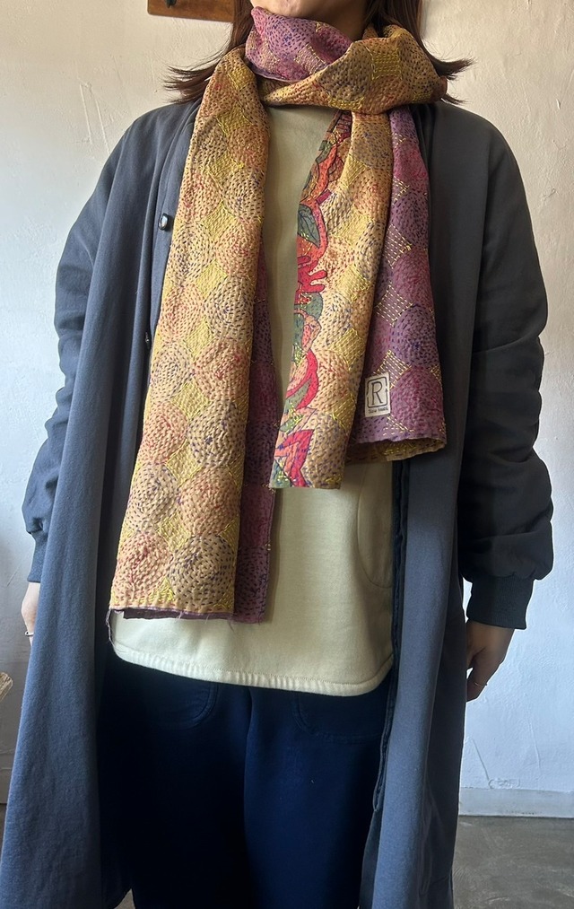 【詳細】 素材:綿100% 原産国:インド 【サイズ】幅43cm 長さ190cm 【商品説明】 カンタ刺繍はインド・ベンガル地方の手工芸品です。サリーを解体して作られた、リバーシブルでお使い頂けるストールです。色や柄は弊社が選び、アレンジしております。